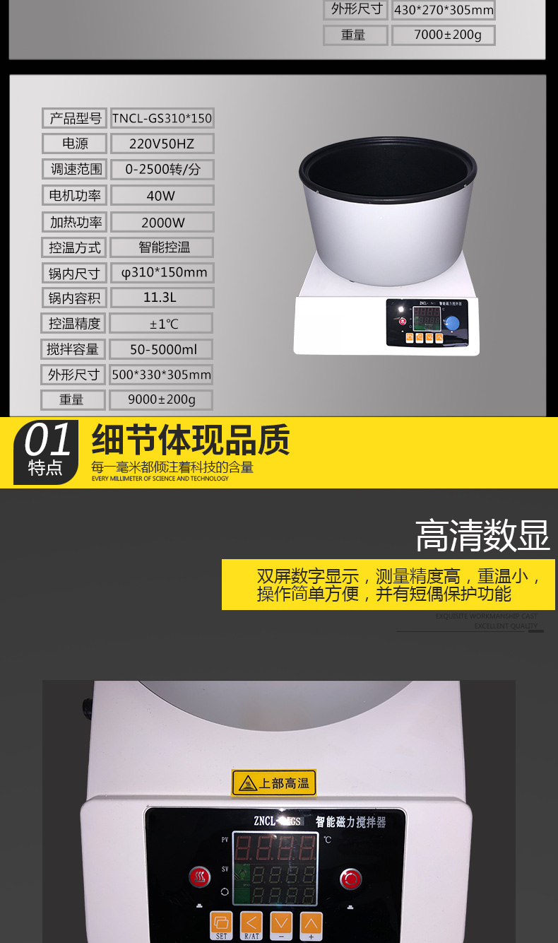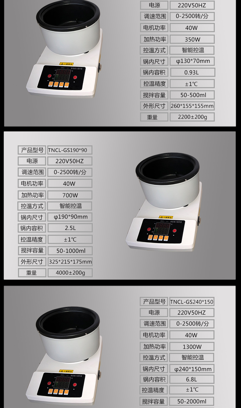 ZNCL-GS型 數顯磁力(加熱鍋)攪拌器,加熱鍋尺寸分四種:直徑130mm高60mm;直徑190mm高105mm;直徑240mm高150mm;直徑310mm高150mm;控溫范圍:室溫-250℃,控溫精度:±1℃;攪拌速度:50-2500轉/分;溫度、轉速均可數字設定;定時功能、調壓功能、液晶顯示可選。